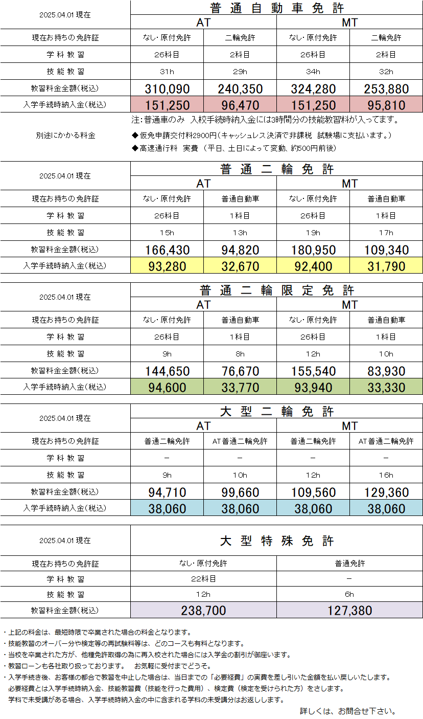 | 入学納入金 | 教習料金のページをご覧下さい。 |